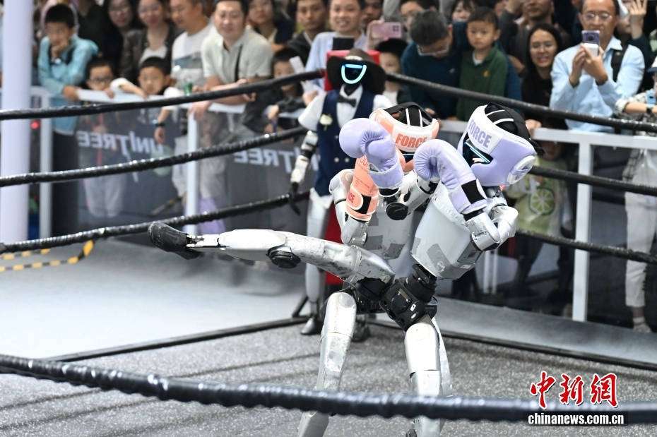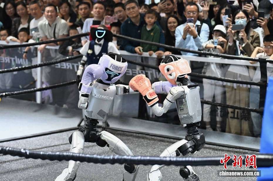 11月15日,在深圳国际会展中心举办的第二十七届中国国际高新技术成果交易会上,参展商宇树人形机器人格斗,吸引众多参观者围观。