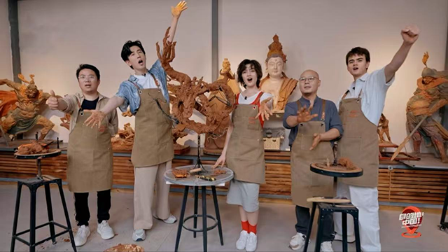 (嘉宾演员李川与免签探路官宋莉乐、雅各布在太原体验泥塑)