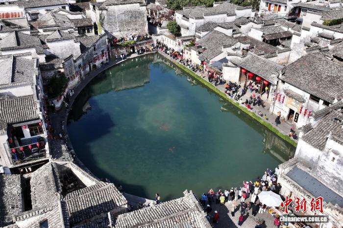 图为航拍安徽省黄山市黟县世界文化遗产地宏村月沼。(无人机照片) (图片来源:本文图片均据中新网)