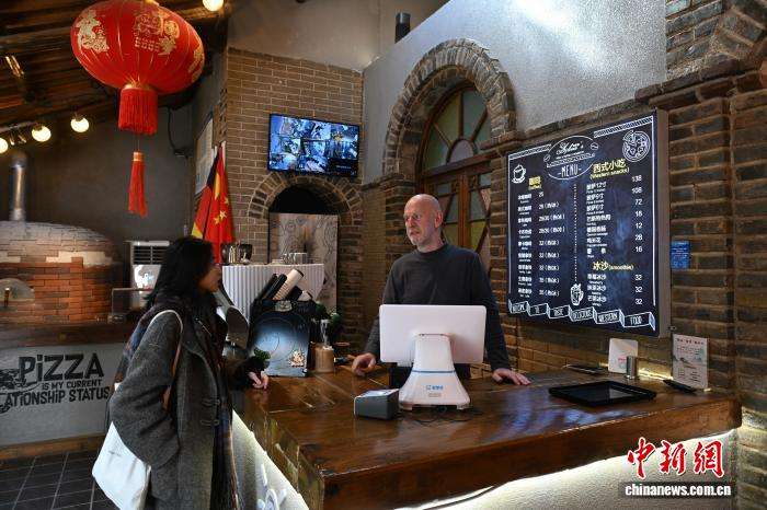 图为华文媒体代表走进宏村,与咖啡店主理人阿明(Armin)交流。