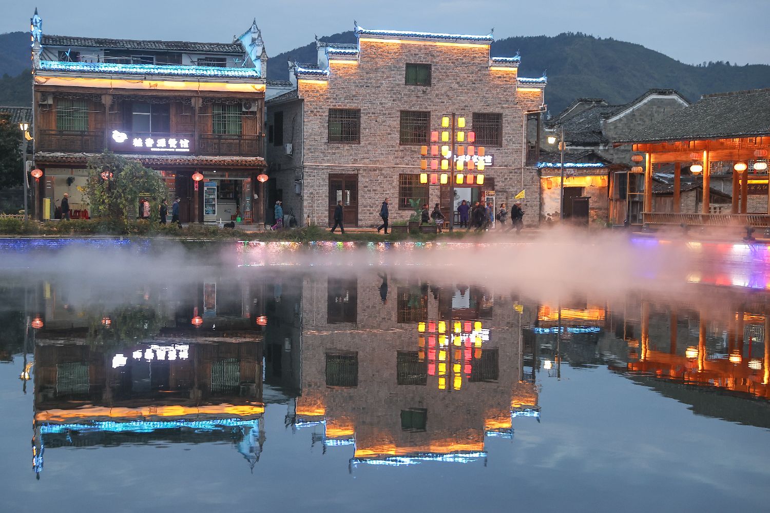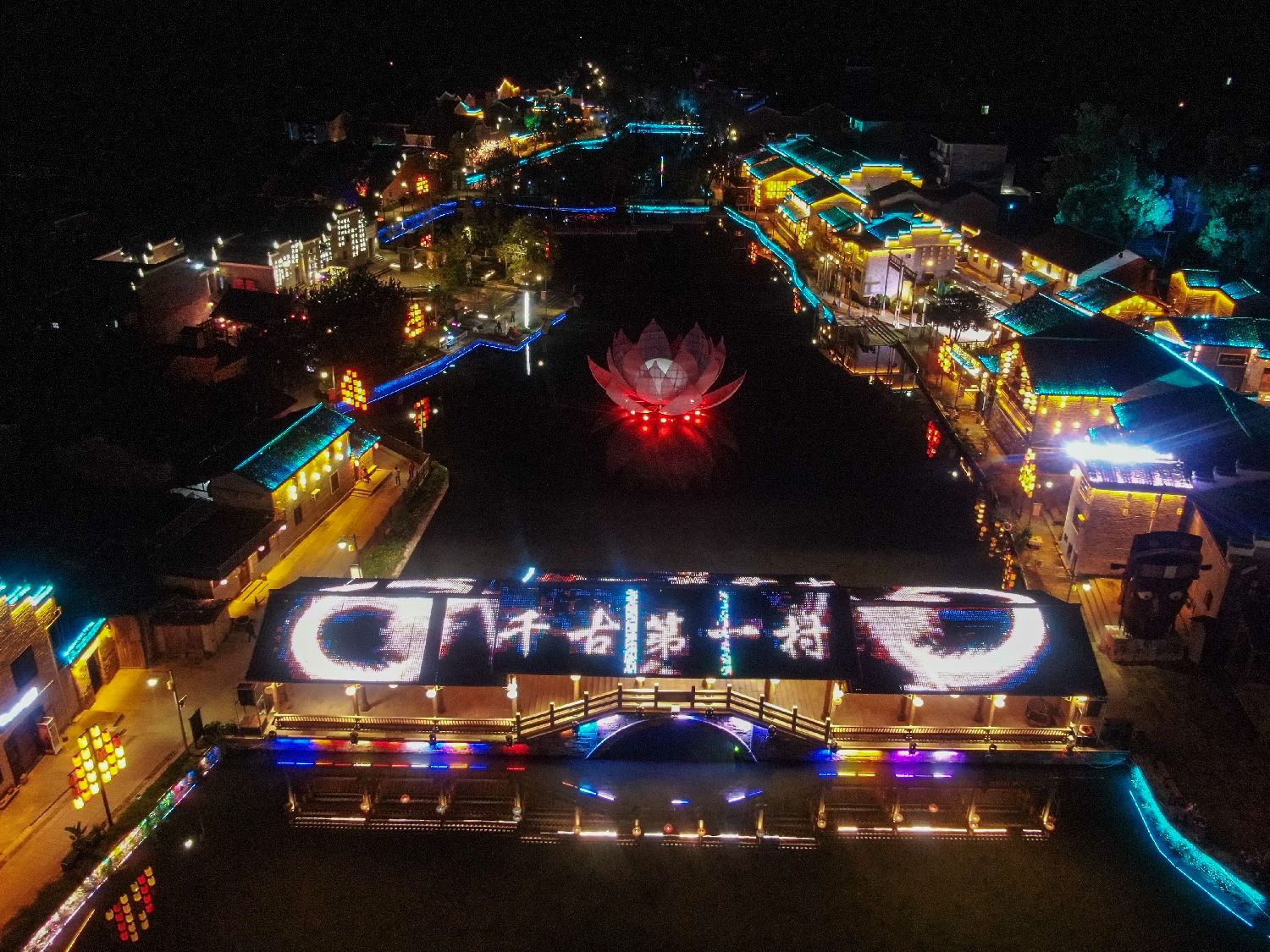 图为航拍灯火璀璨的流坑古村(无人机照片)。