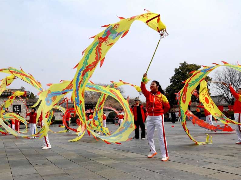 花戏楼景区广场,民间艺人在进行舞龙表演活动。(图片来源:黄涛摄)