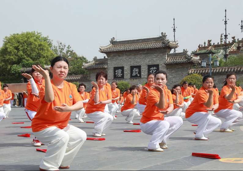 花戏楼广场内,体育爱好者展演非遗文化项目“华佗五禽戏”。(图片来源:程诚摄)