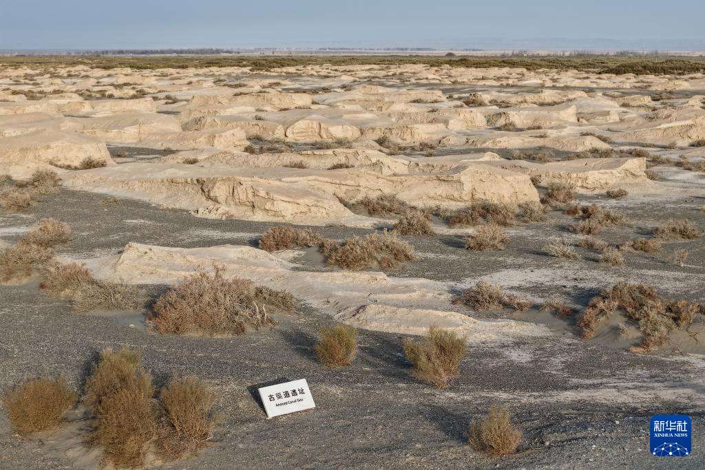 11月18日在甘肃省瓜州县拍摄的农业灌溉渠系遗迹中的古渠道遗址(无人机照片)。