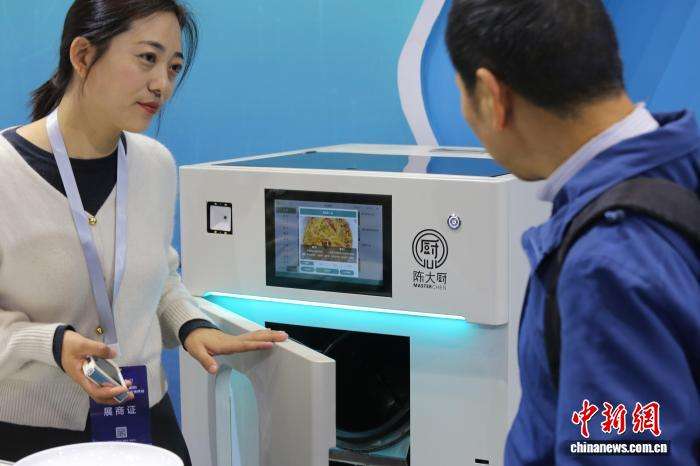 图为参会者了解智能炒菜机器人。