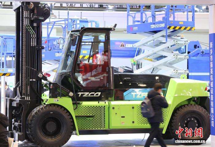 图为博览会展示的一辆16吨锂电平衡重叉车。