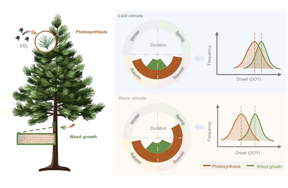 进一步模型分析表明,木质部生长除了需要春季积温,还必须经过冬季足够的低温积累,即“冷激”来打破休眠;冬季升温使冷激不足,导致生长启动滞后,而光合作用几乎不受冷激限制,从而加剧这种“步调不一致”的现象。