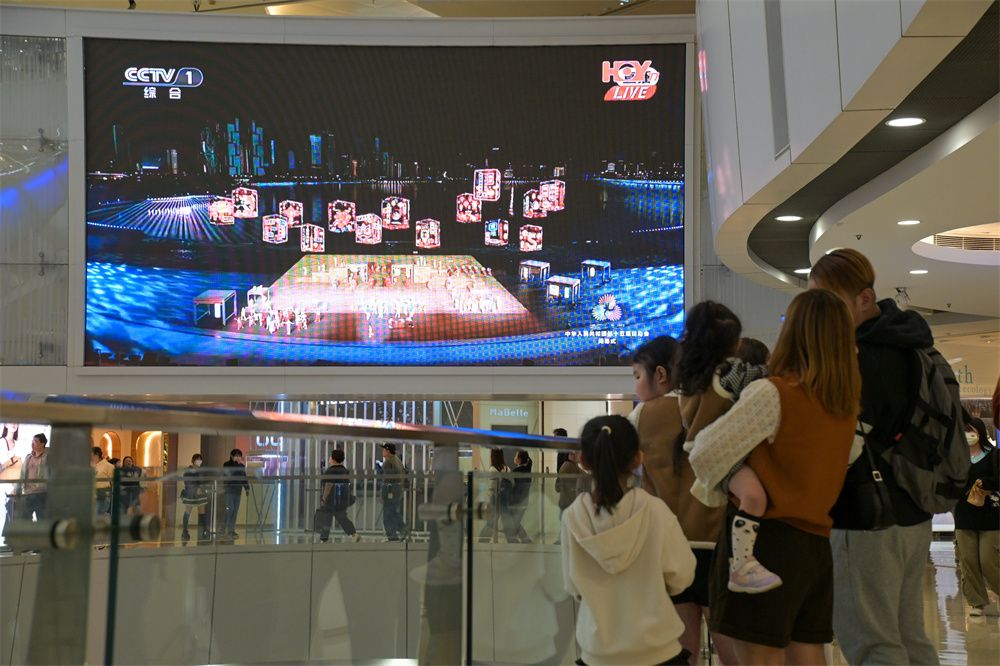 11月21日,香港市民在一家商场观看第十五届全国运动会闭幕式直播。(图片来源:中新社)