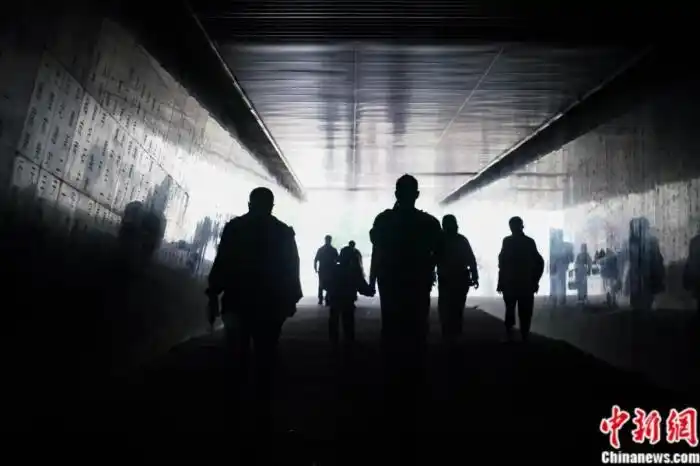 9月16日,黑龙江哈尔滨,观众从侵华日军第七三一部队罪证陈列馆的“证言墙”通道走出。(图片来源:中新网)