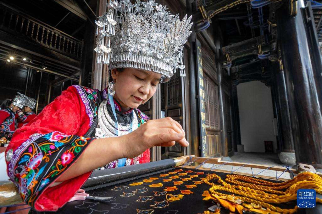 11月23日,重庆酉州苗绣市级传承人陈国桃在2025非遗品牌推广周上刺绣。