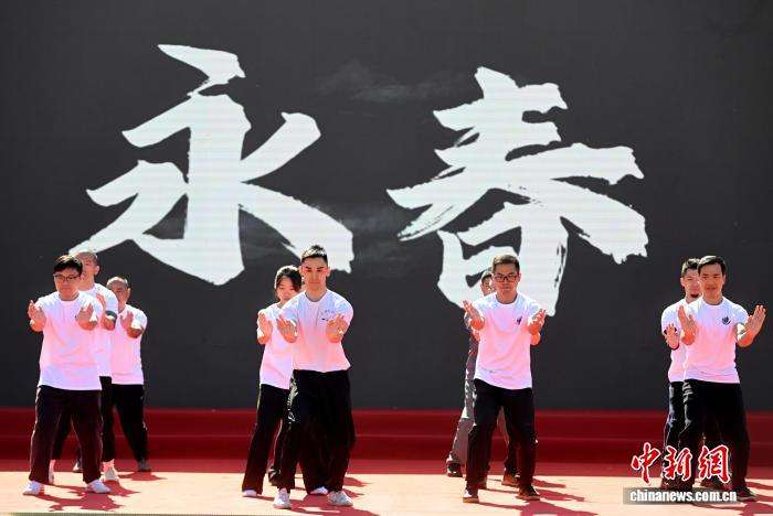 白鹤拳发源于中国知名侨乡永春县,有着“东方神拳”的美誉。历经300多年的传承发展,永春白鹤拳已远播全球80多个国家和地区,每年吸引着数千名“洋弟子”前来永春学习。图为81岁的苏瀛汉(中)一家三代同台表演永春白鹤拳。(图片来源:本文图片均据中新网)