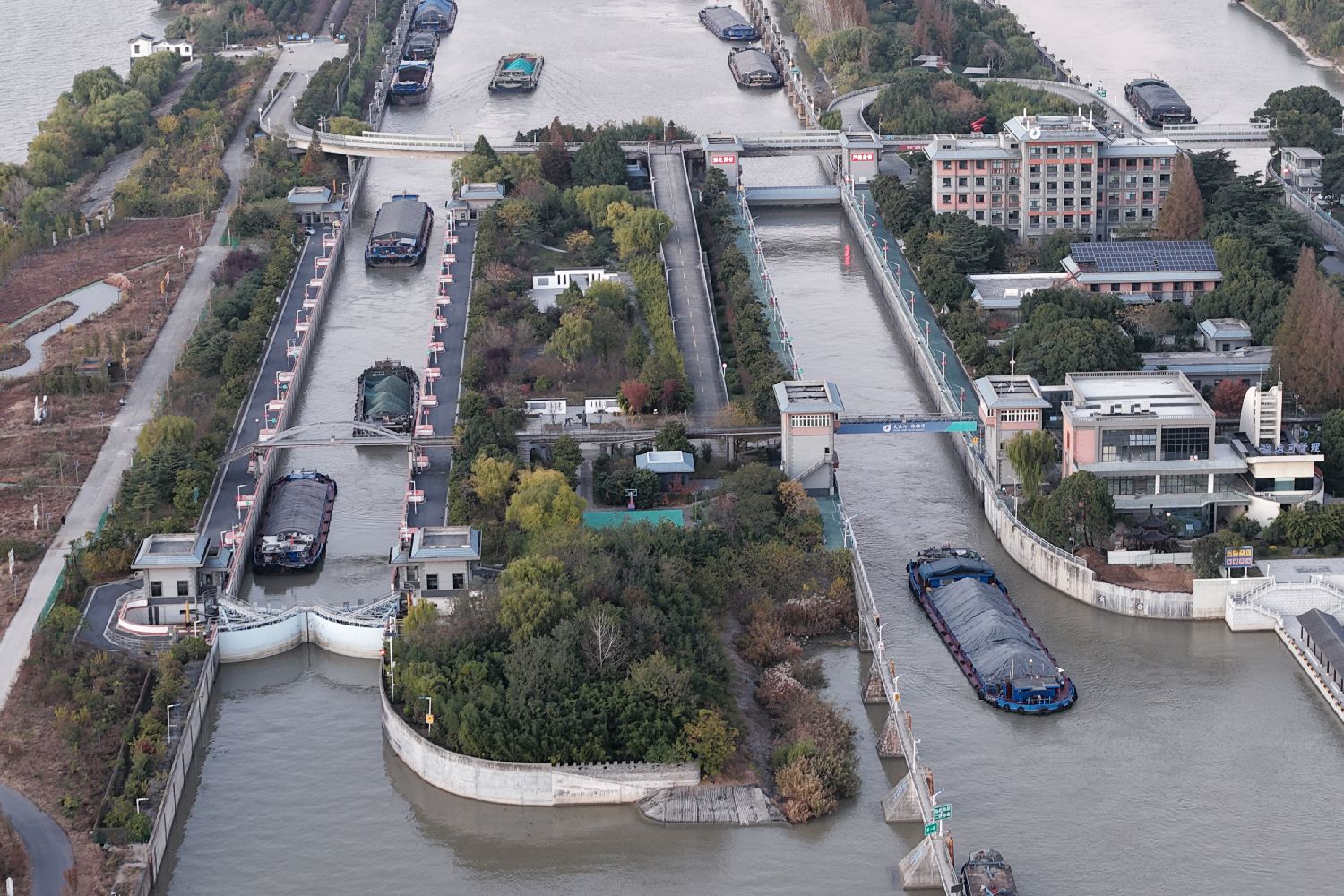 11月25日,江苏扬州,船舶顺利通过京杭运河邵伯船闸。