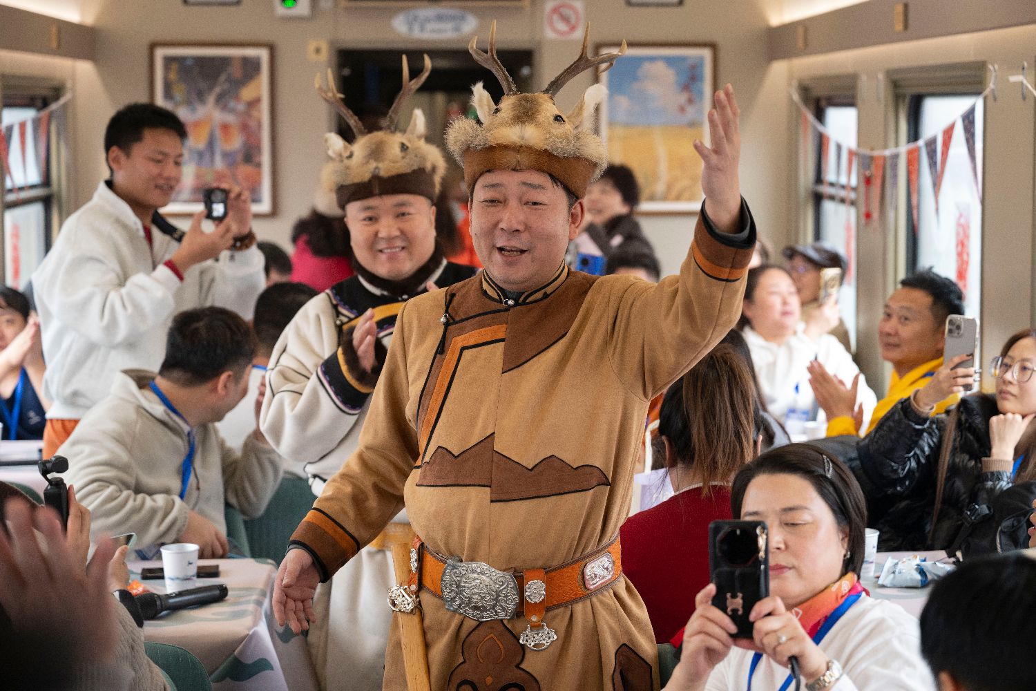 11月26日,在Y783次“悠享龙江·银旅号”旅游列车上,鄂伦春族演员在表演。当日,300余名游客在哈尔滨火车站登上Y783次“悠享龙江·银旅号”旅游列车,开启为期6天的“找北”之旅。(图片来源:本文图片均自新华社)