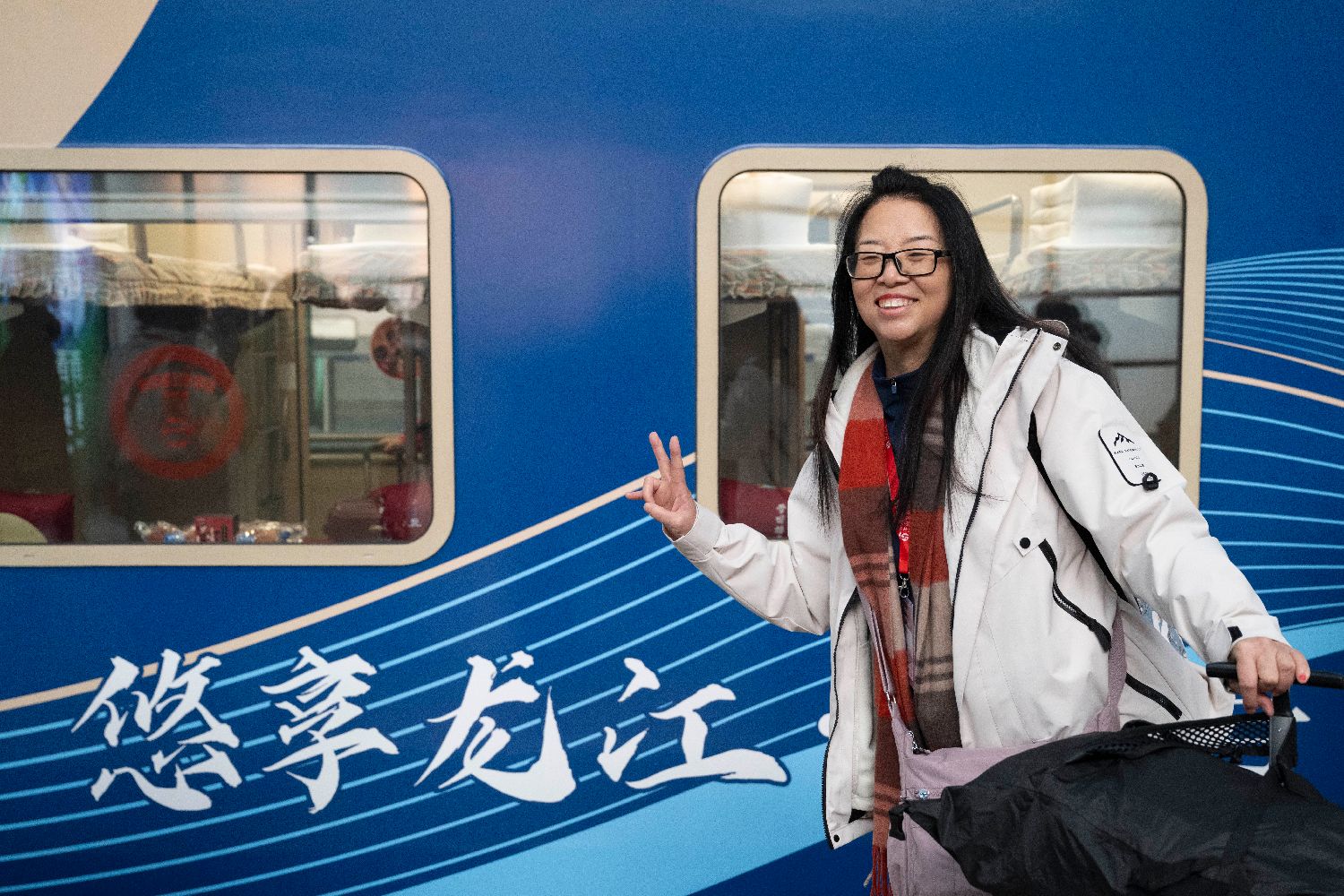 作为冰雪旅游产品体系的重要组成部分,本趟专列以“慢旅行、深体验”为理念,通过主题装饰、文化讲解和互动活动,展现北国风情,致力于打造“移动的文化地标”,进一步促进冬季旅游,为冰雪经济注入新活力。图为11月26日,工作人员在Y783次“悠享龙江·银旅号”旅游列车上为旅客表演萌虎韵律操。