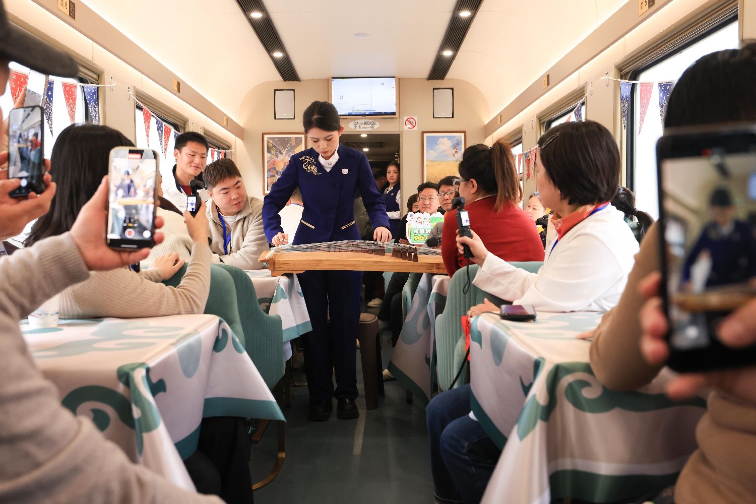 11月26日,工作人员在Y783次“悠享龙江·银旅号”旅游列车上为旅客表演古筝。