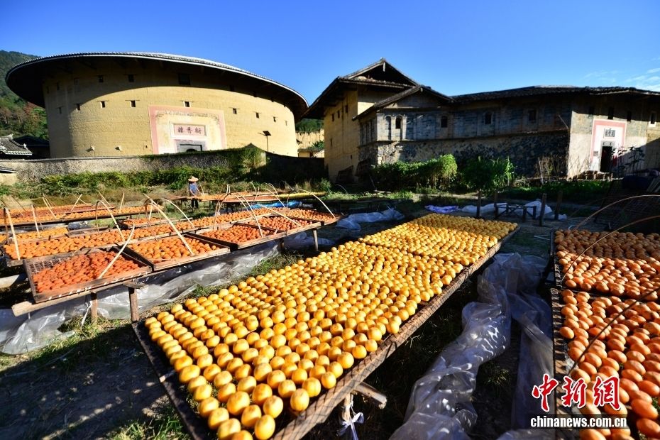 入秋后,村民正在晾晒收获的红柿,准备制作成传统客家柿饼。图为村民在土楼旁晾晒的柿子。