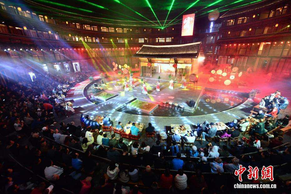 2025年11月22日晚,游客在福建土楼王子景区观看歌舞剧《客》,沉浸式体验永定的风土人情。