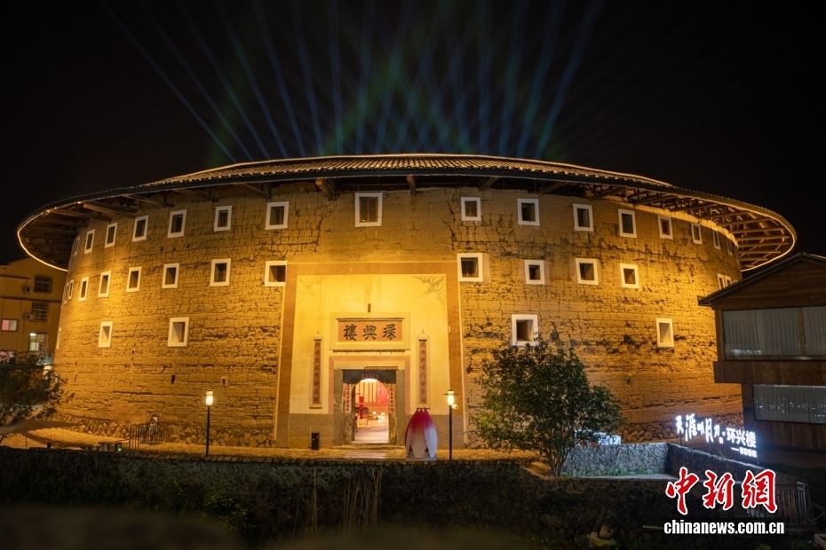 洪坑村的庆成楼在灯光的映照下绚丽夺目,宛若“金楼”。