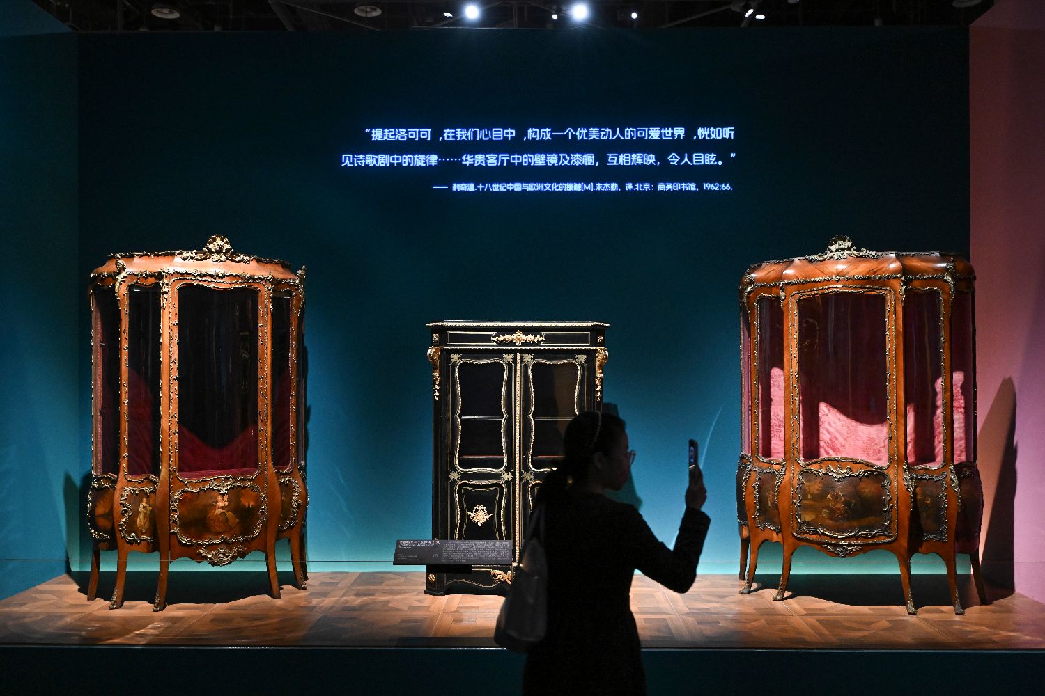 11月27日,展览中展出的法国威尔斯·马丁漆陈列柜(1对)和铜鎏金布尔式木柜。当日,《“髹漆”与共——清代广作外销漆器》在位于广州的广东省博物馆正式开展。(图片来源:中新社)