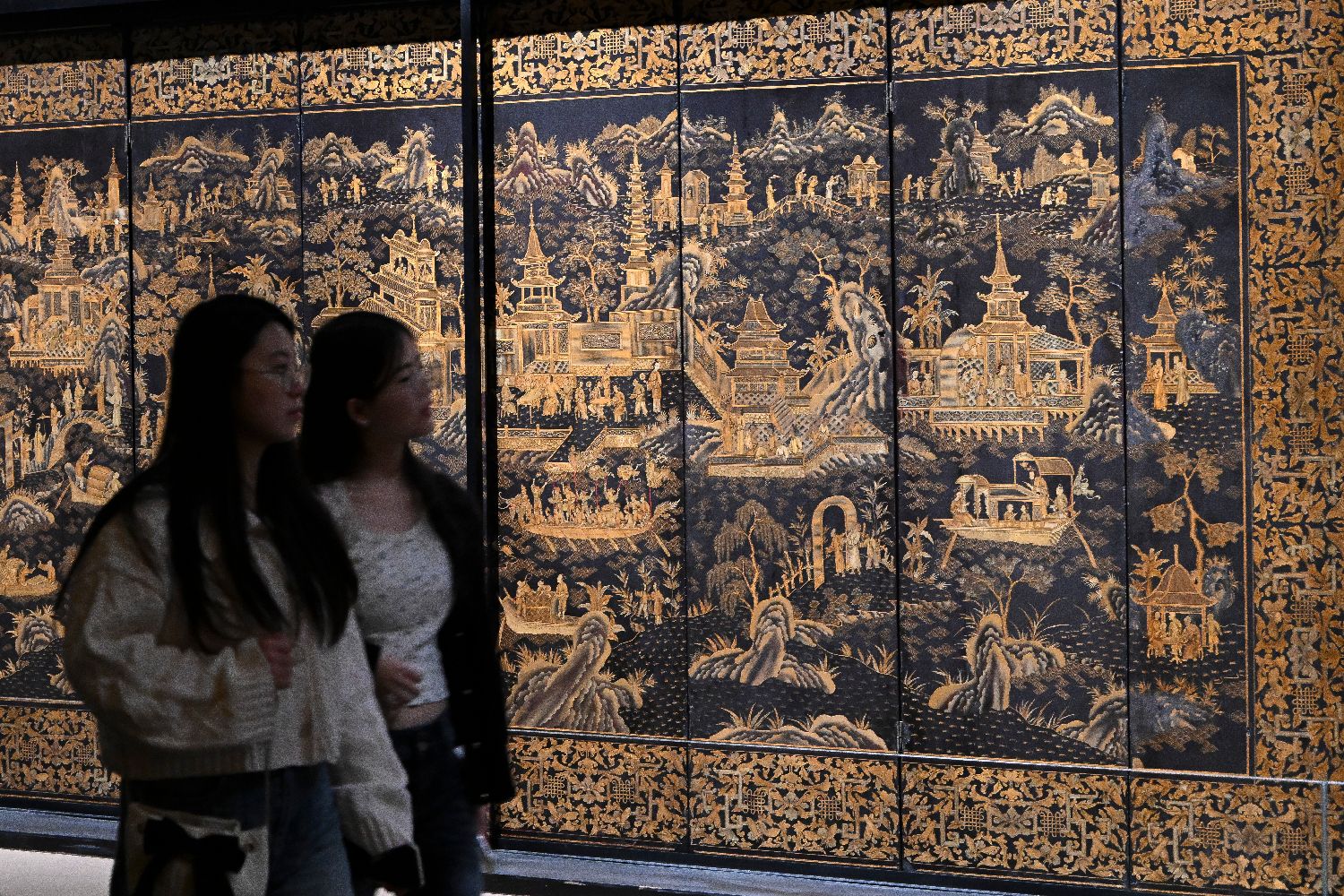 该展以130余件/套珍贵藏品,追溯中国漆艺的发展脉络,解密岭南漆艺的地方特色,向观众呈现广作外销漆器在对外贸易与文化交流中的成就与贡献。图为展览中展出的19世纪早期木胎黑漆描金龙舟竞渡图八围屏风。(图片来源:中新社)