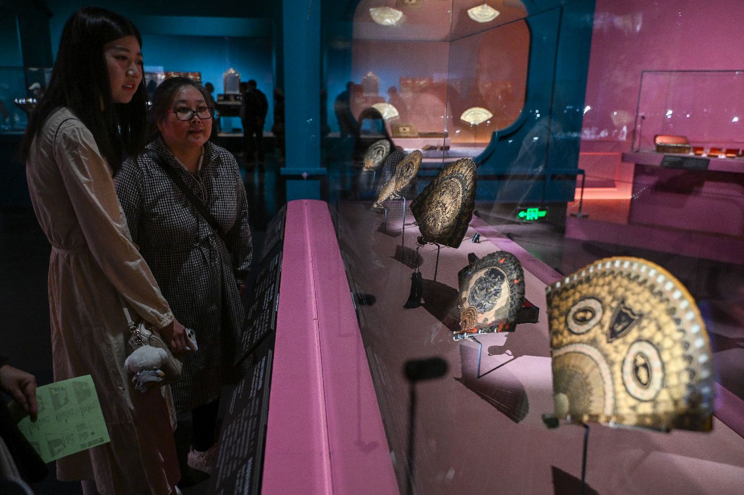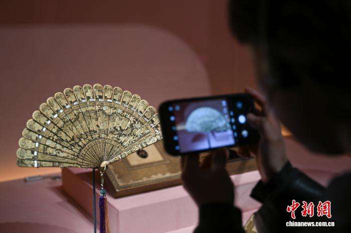 展览中展出的黑漆描金扇形开光庭院人物扇。(图片来源:中新网)