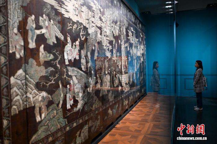 展览中展出的款彩群仙贺寿图屏风。(图片来源:中新网)