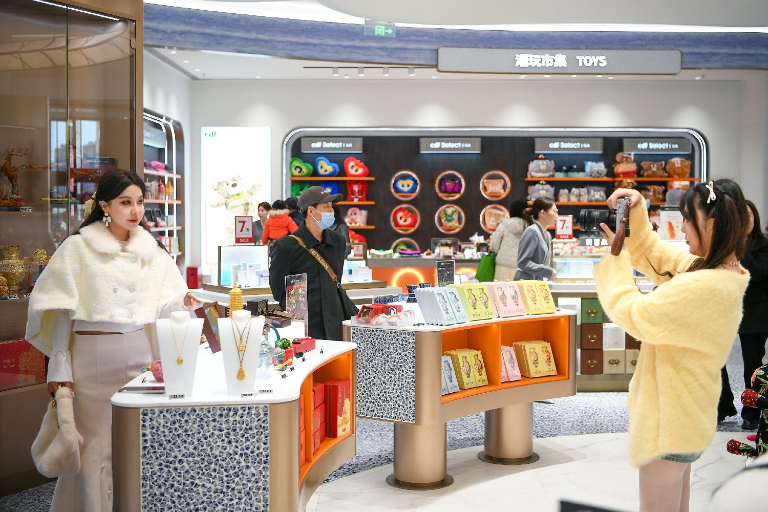 门店经营面积1105.5平方米,以“免税+有税”、“进口+国产”、“线下+线上”为经营模式,免税商品涵盖香水化妆品、腕表首饰、太阳镜、酒水、旅行电子;有税商品涵盖保健品、潮玩、有税酒水及国潮优品。图为11月28日,顾客在店内购物。