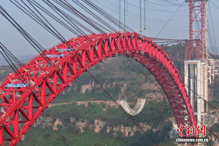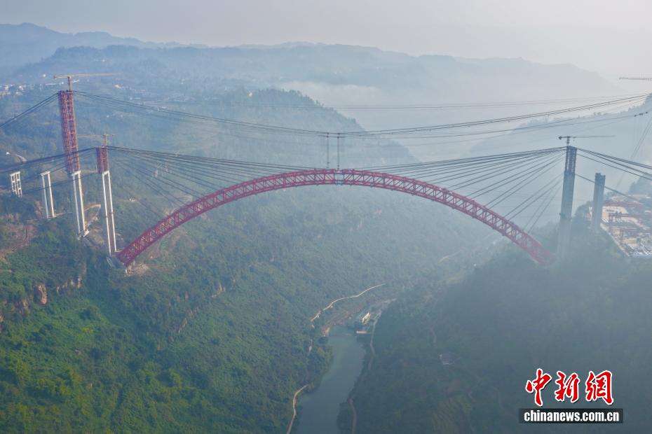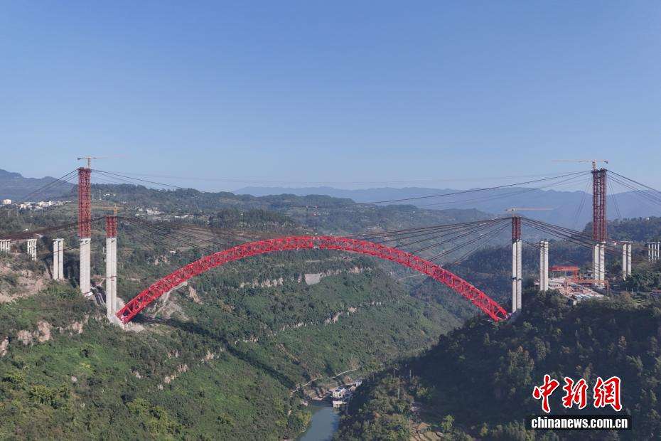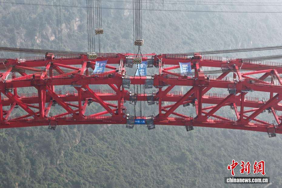 11月27日,建设中的凤来大溪河特大桥。当日,世界跨径最大的钢拱桥——重庆武隆至两江新区高速公路凤来大溪河特大桥钢桁拱成功合龙。(图片来源:本文图片均自中新网)