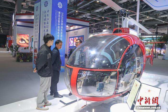 图为绿色发展展区,江西直升机有限公司制造的JH-2“小朱雀”直升机吸引参观者。