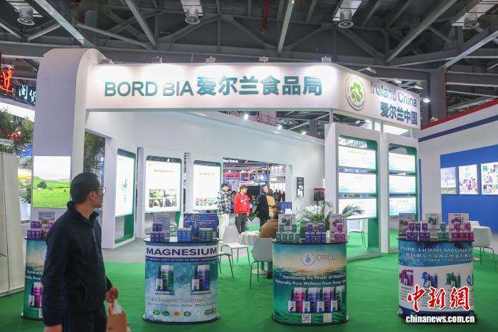 图为绿色发展展区,观众从本届博览会主宾国之一爱尔兰的展馆前经过。