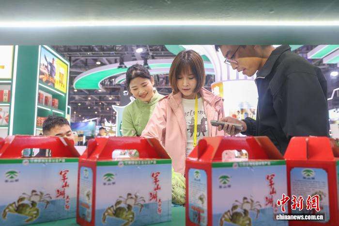 图为绿色食品展区,参观者在选购江西军山湖大闸蟹。