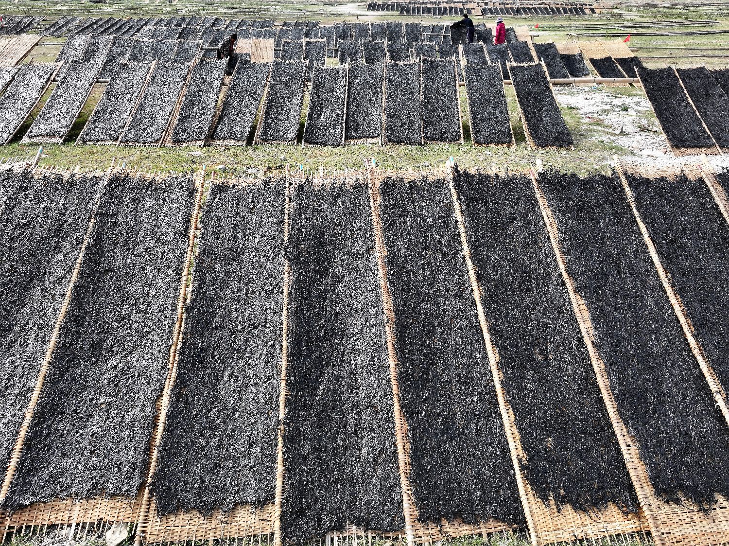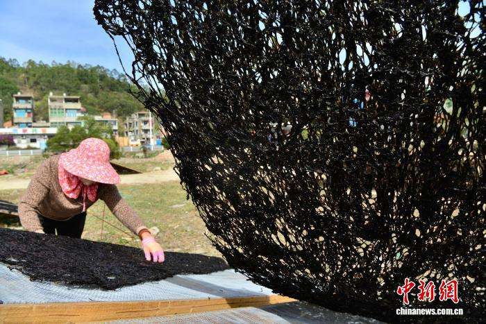 眼下,正是“头水”紫菜收割季。连日来,福建知名侨乡连江县浦口镇1000多亩“头水”紫菜进入集中采收期,种植户们抢抓晴好天气陆续收晒“头水”紫菜。图为11月27日,一处晾晒场正在晾晒中的紫菜。(图片来源:中新社)