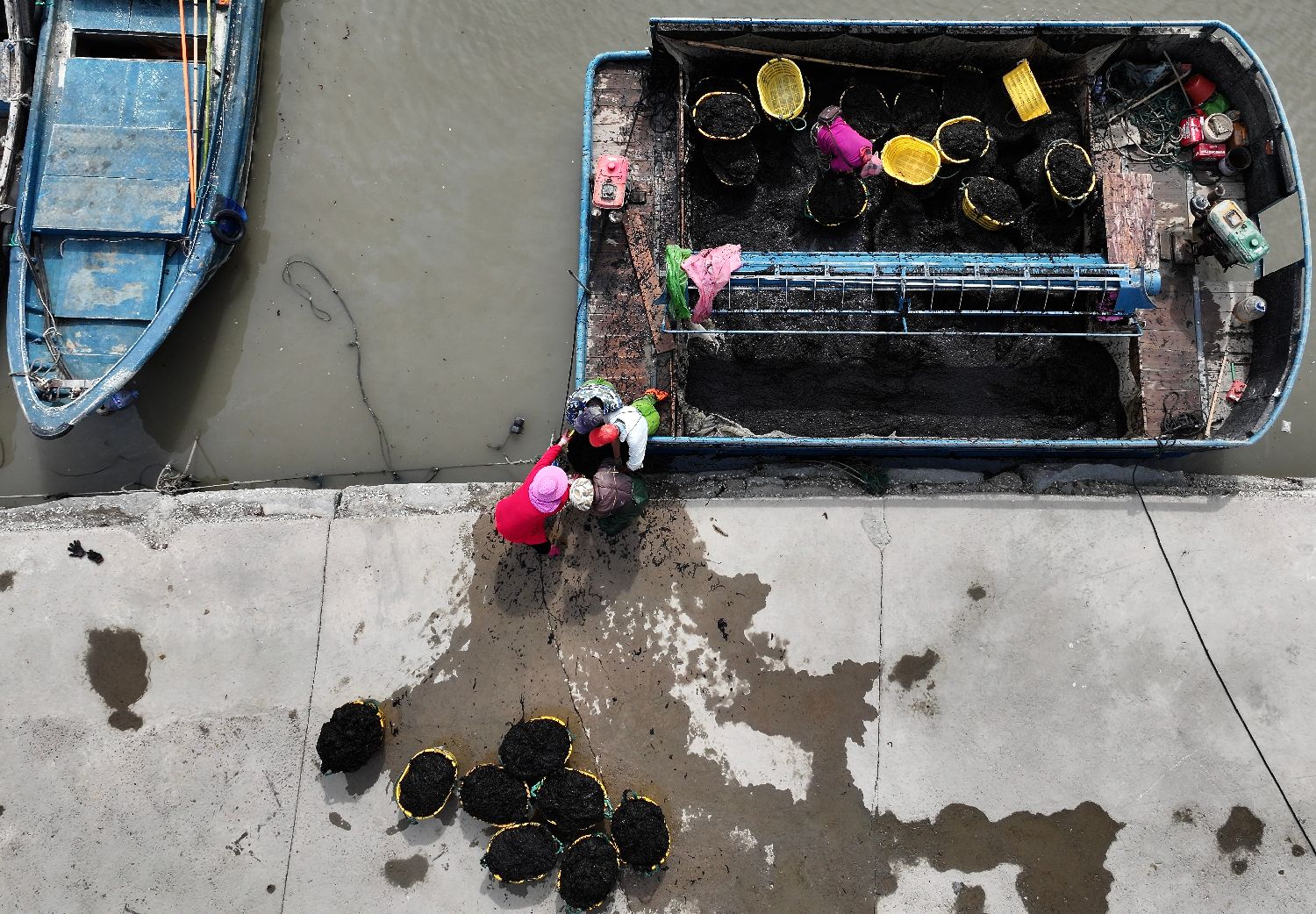 浦口镇地处敖江入海口,得天独厚的地理环境造就了这里紫菜的优良品质。图为11月27日,紫菜种植户在码头装运刚采收的新鲜紫菜。(图片来源:中新社)
