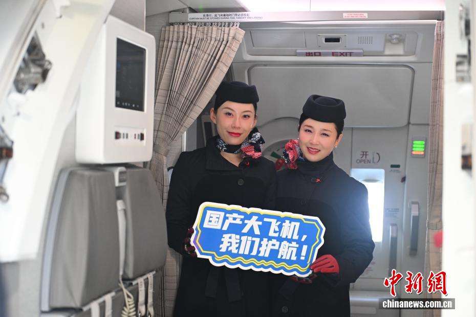 C919执飞的东航MU9179航班机组人员在客机内合影。(图片来源:中新网)