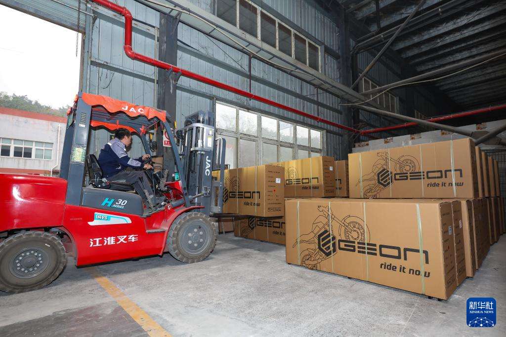 12月2日,在重庆炙焱动力制造有限公司,工人将打包好的摩托车码放整齐等待出口。该公司生产的摩托车主要出口至拉美、东南亚、欧洲等市场。(图片来源:本文图片均据新华社)