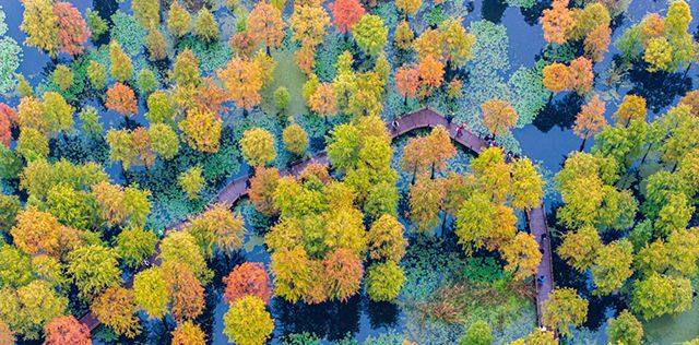 池杉湖国家湿地公园内的5万多棵池杉红绿黄相间,五彩缤纷,色彩绚丽,栈道蜿蜒掩映。(图片来源:李晓村 摄)