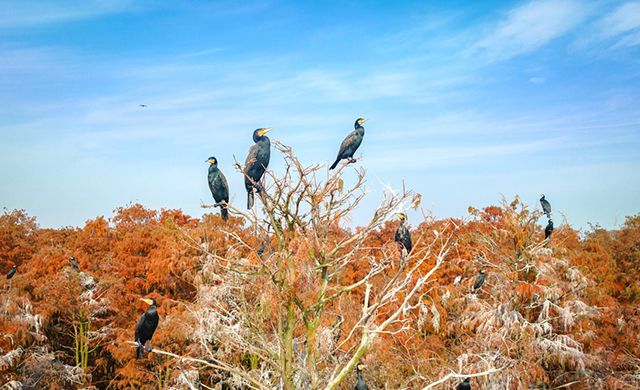 秋去冬来,满湖池杉染上浓烈绯红,位于滁州市来安县雷官镇的安徽池杉湖国家级湿地公园,迎来一年中最富诗意的观鸟佳期。白头鹤、东方白鹳、白琵鹭、小天鹅、豆雁等数万只候鸟陆续齐聚,时而在枝头栖息嬉戏,时而振翅掠过天际,时而在水面追逐游玩,上演着一场盛大的冬日候鸟嘉年华。