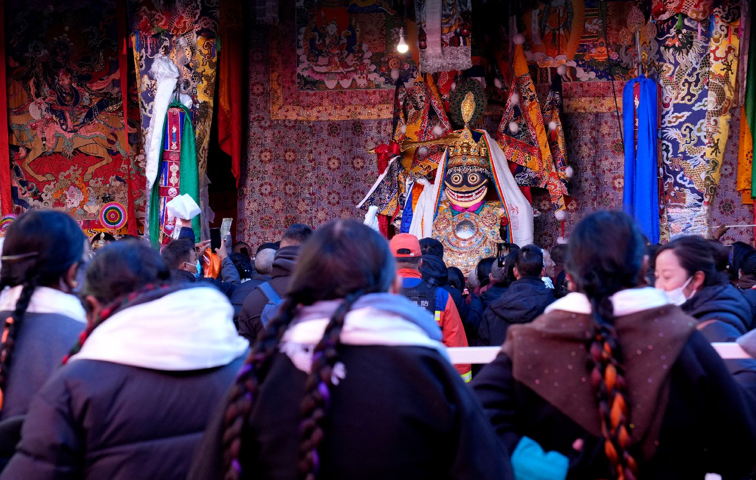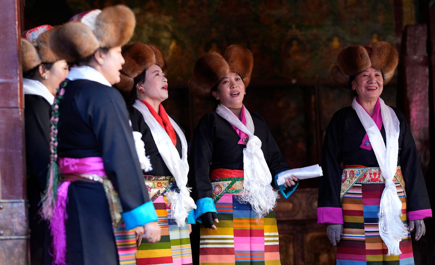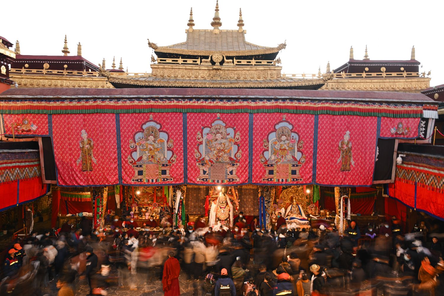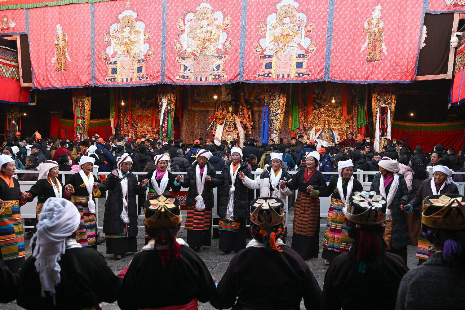 身着盛装的信众在大昭寺内载歌载舞。(图片来源:本文图片均据中新社)