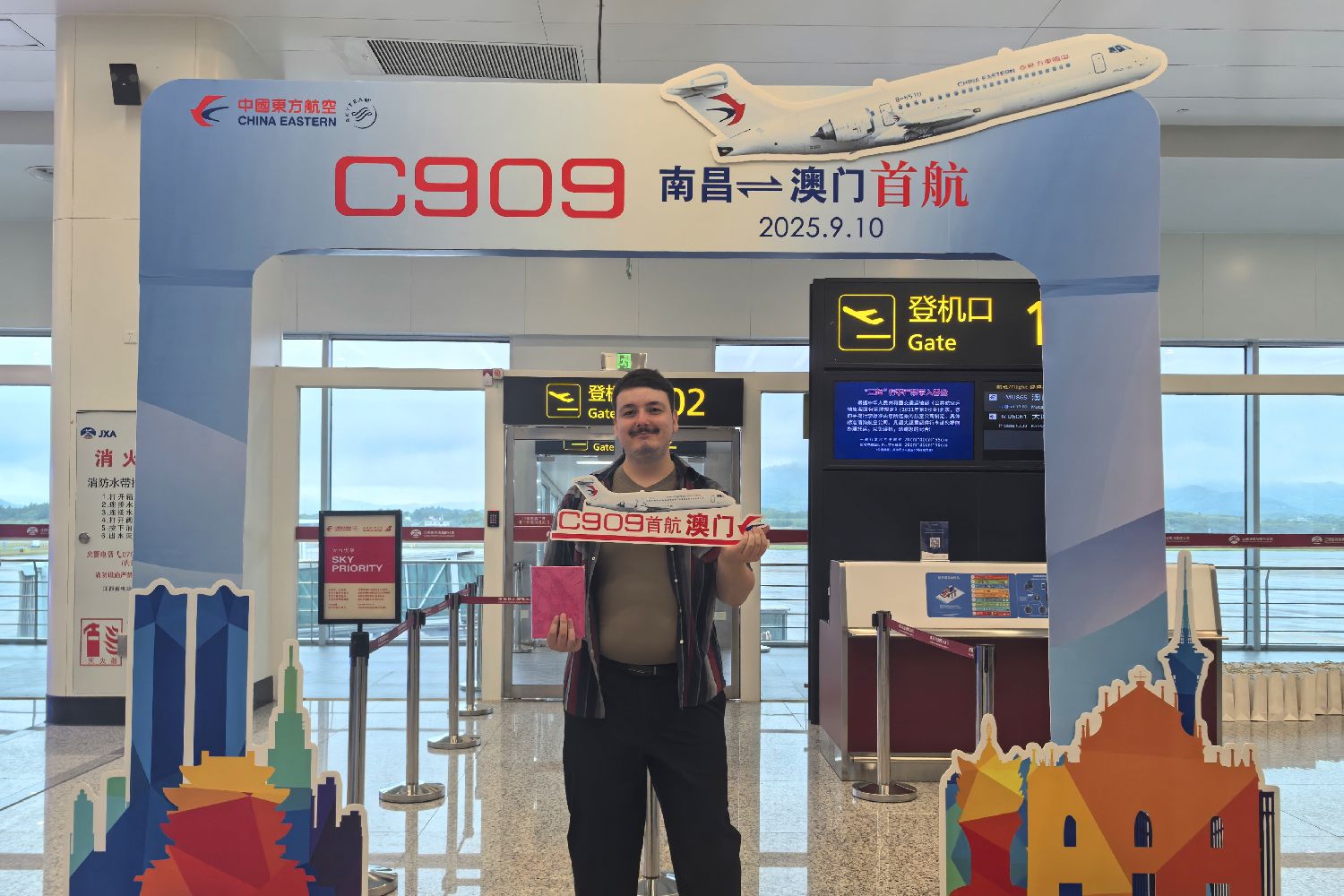 9月10日,在南昌昌北国际机场,一名法国旅客在登机口拍照留念。当天,中国国产客机C909首条地区航线——南昌至澳门航线开通,由C909客机执飞的MU865航班从南昌昌北国际机场起飞,飞往澳门国际机场。(图片来源:中新社)