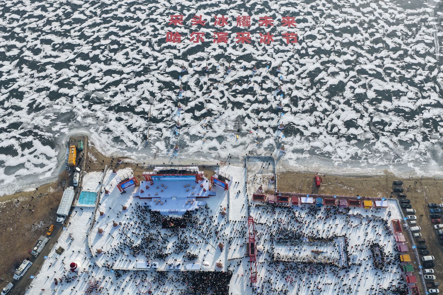 12月7日拍摄的第六届哈尔滨采冰节现场(无人机照片)。