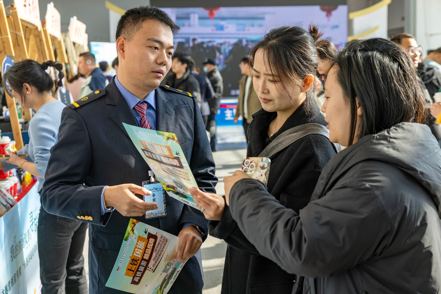 12月5日,工作人员在泰州站给旅客介绍长三角高铁旅游精品线路。