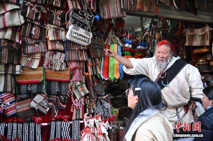 图为藏式老物件店主次仁罗布向游客推荐藏式氆氇侧挂包。