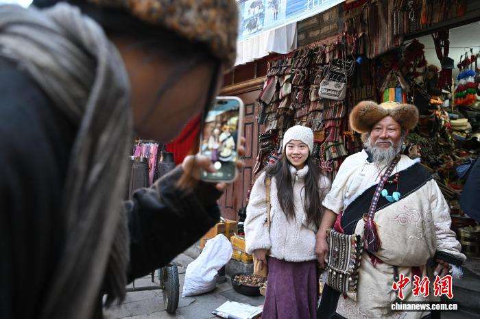 图为藏式老物件店主次仁罗布与游客合影。
