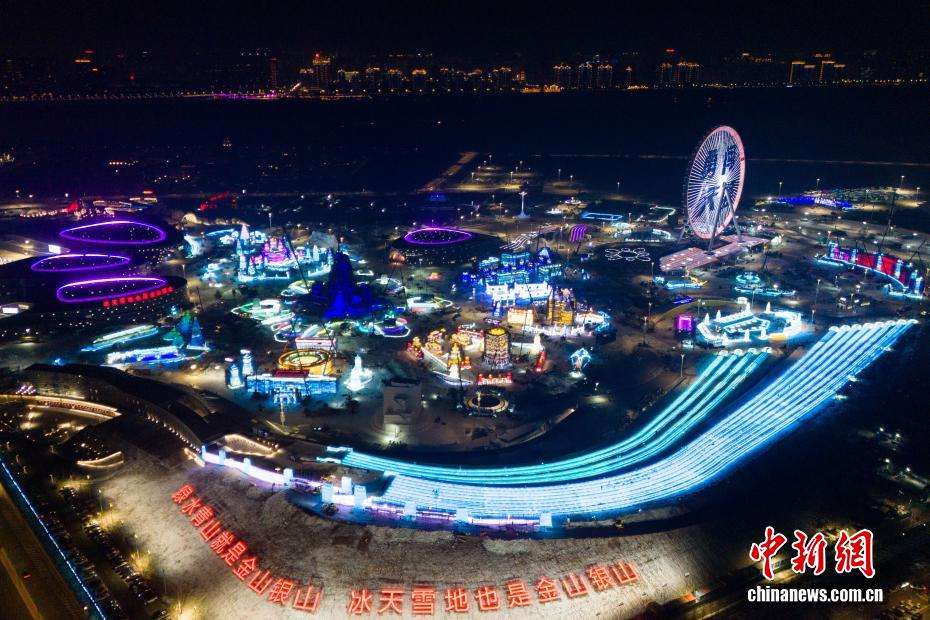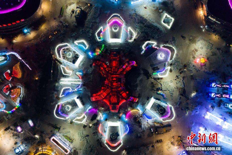 图为哈尔滨冰雪大世界主塔“冰灯启梦”。(无人机照片)