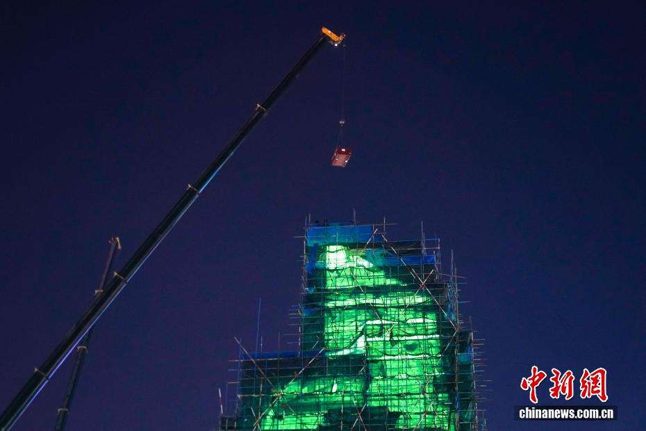 图为施工人员对哈尔滨冰雪大世界主塔“冰灯启梦”最后一块冰体进行调整。(无人机照片)