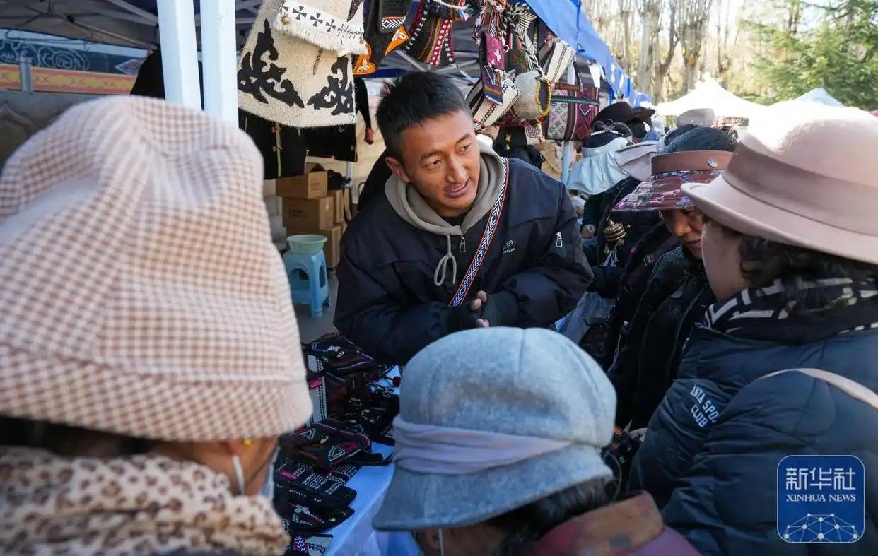12月10日,商户在拉萨市宗角禄康公园的供销大集上向顾客介绍商品。