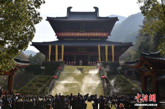 图为大量游客在缙云黄帝祠宇观看《轩辕赞》演绎。黄帝祠宇是中国南方祭祀轩辕黄帝的主要场所和黄帝文化辐射中心。作为凝聚民族情感的精神纽带,近年来黄帝祭典等寻根问祖活动已吸引6000多名港澳台同胞及海外侨胞参加。