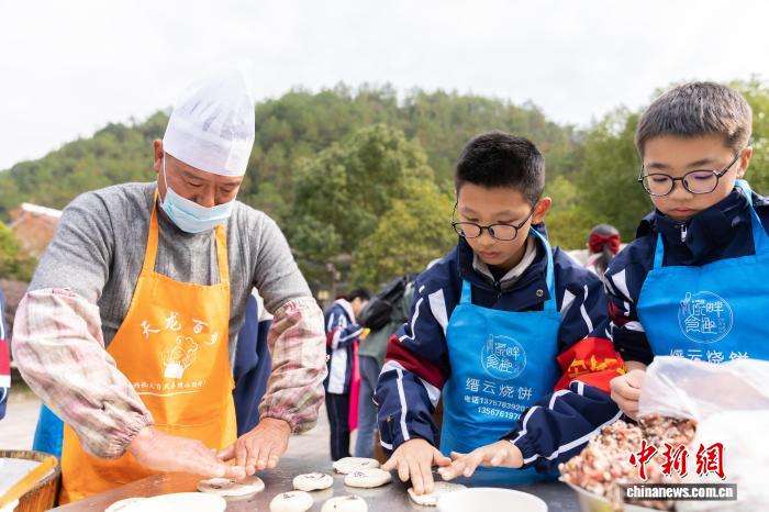 图为多名小朋友体验缙云烧饼制作。传统小吃缙云烧饼亦称“轩辕饼”,其制作技艺已入选中国国家级非物质文化遗产代表性项目名录。如今缙云烧饼产业年产值约40亿元人民币,带动5万多人就业。作为一项乡愁富民产业,缙云烧饼已走出中国国门,全球门店达到8000多家,覆盖16个国家和地区。