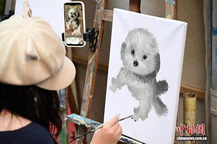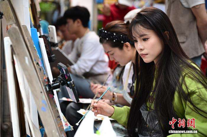 12月11日,游客在大芬油画村体验画油画。