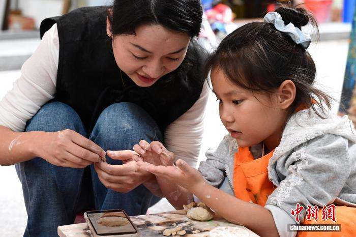 12月11日,家长和小朋友在大芬油画村体验陶艺制作。